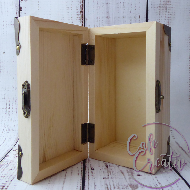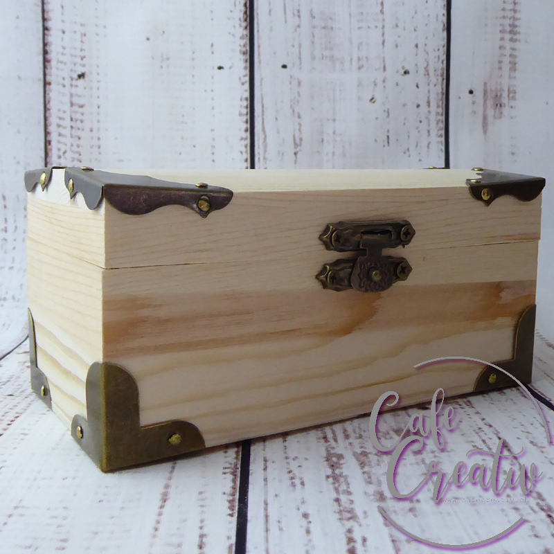 Kleine Holztruhe mit Scharnieren, Beschlägen und Verschluss.