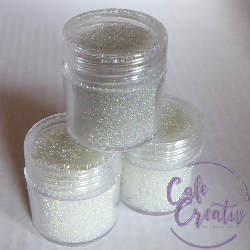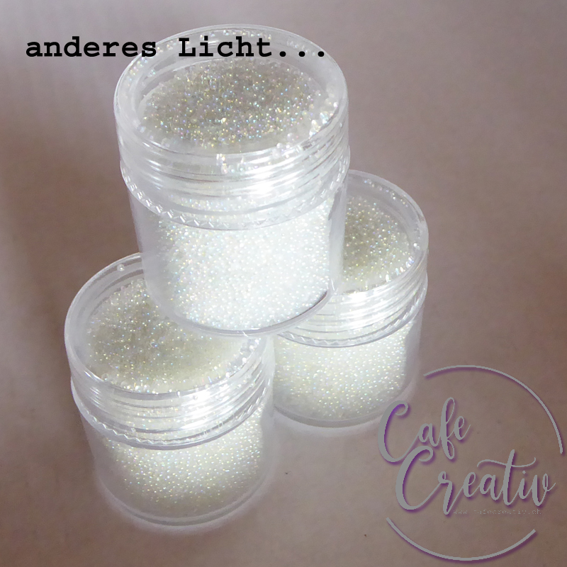 Kleine Glaskügelchen in verschiedenen Kleinen (oder wie nennt man klitzekleine Grössen??!?) zum einstreuen, aufkleben, liebhaben und verfluchen.