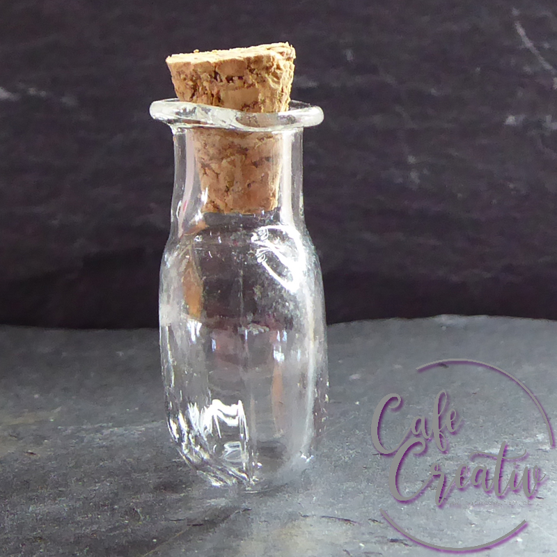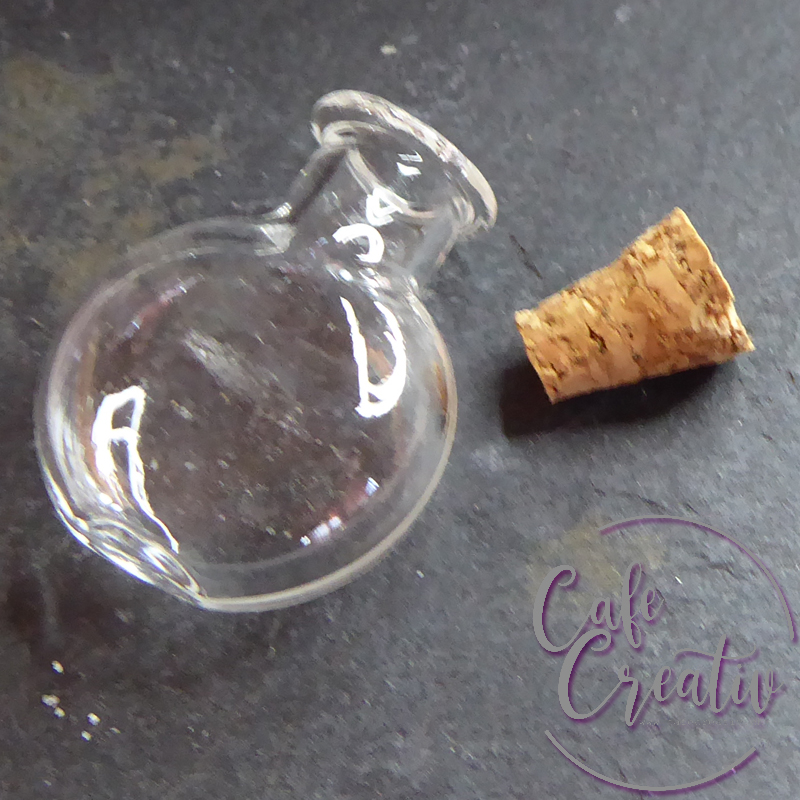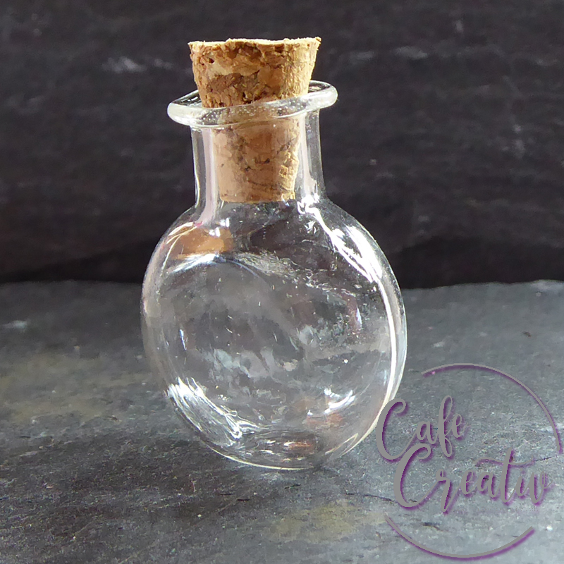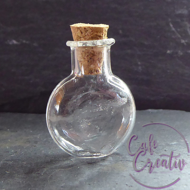 Kleiner Glasflachmann rund, mit Korkzapfen.